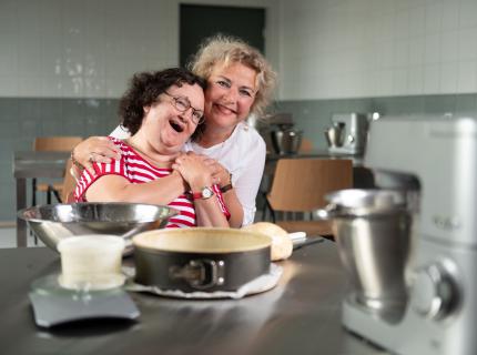 Karin en Henriëtte werken graag in de keukengroep en het serviceteam. Met het serviceteam zorgen ze ervoor dat de was wordt opgevouwen, dat er koffie en thee is en dat de tafels voor de gasten klaarstaan. Met de keukengroep maken ze allerlei lekkere dingen, vertelt Henriëtte. “We bakken taart en koekjes, maar we maken ook hele maaltijden. En van vers fruit maken we jam. Die verkopen we dan weer in de winkel. We hebben altijd veel lol in de keuken. Onze begeleider Hanneke wil altijd de snoepjes opeten die eigenlijk in de koekjes moeten, maar dat mag natuurlijk niet. Dat is heel grappig!”