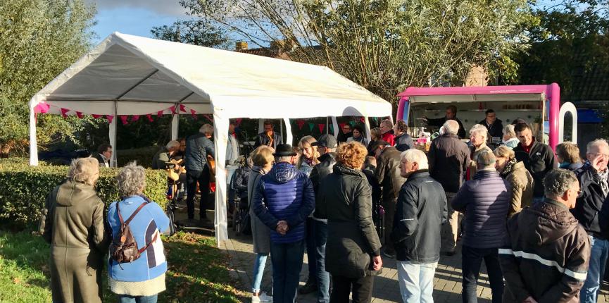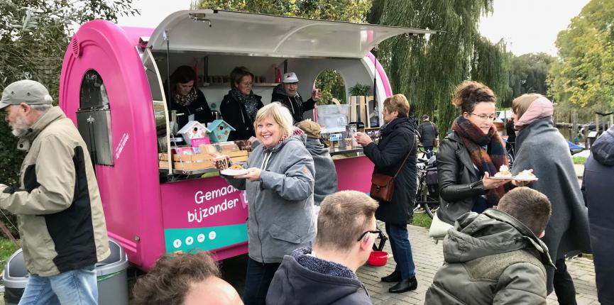 Na een frisse ochtend komt het zonnetje door en bezoekers vinden hun weg naar de Kleine Schans. Er zijn veel vaste klanten, buurtbewoners, cliënten, familie en vrienden. Hans en Steffie, medewerkers van de foodtruck, lopen af en aan met koffie, chocomel en warme pompoensoep. Dat de foodtruck ook deze zomer weer een fijne plek was om neer te strijken blijkt uit de reactie van vaste klanten.