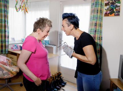 Muzikaal is Wilma ook. Ze pakt haar melodica erbij en speelt zonder haperen een liedje uit een boek vol bladmuziek. “Beneden bij de dagbesteding hebben we vaak ook muziek aanstaan. Het liefst hoor ik Omroep Brabant, dat is gezellige muziek. Ik vind het trouwens ook leuk om te zingen. Nederlandstalige liedjes, of kerkliedjes.” Het liefst zingt Wilma in de douche. Inge, haar begeleider, zingt dan graag met haar mee. “Dat galmt zo lekker. Dus als ik Wilma help met douchen, zijn we meestal samen aan het zingen.”